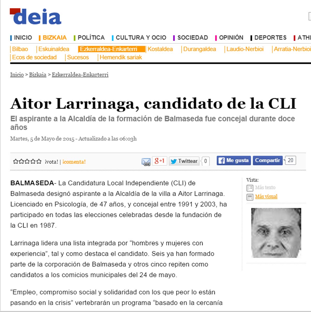 Hoy ha aparecido un artículo de Elixane Castresana en el periódico Deia dedicado a la Candidatura Local Independiente y al candidato por la formación a la alcaldía, Aitor Larrinaga.